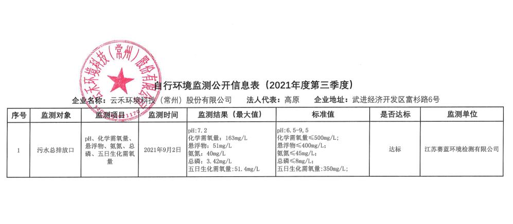 云禾环境2021年第三季度环境检测信息公开