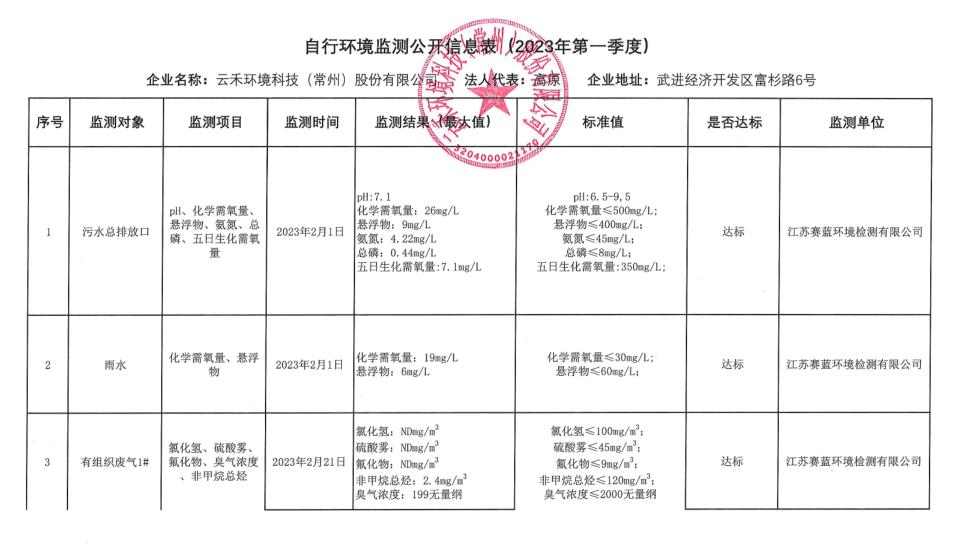 云禾环境2023年第一季度自行监测信息公示